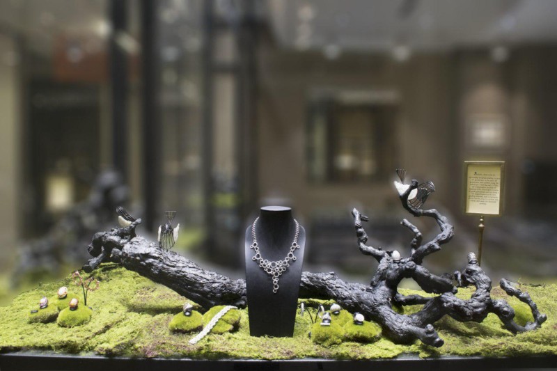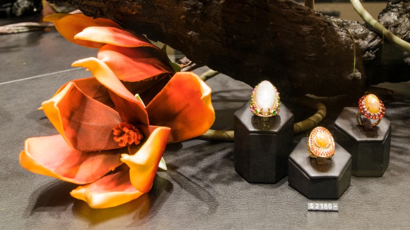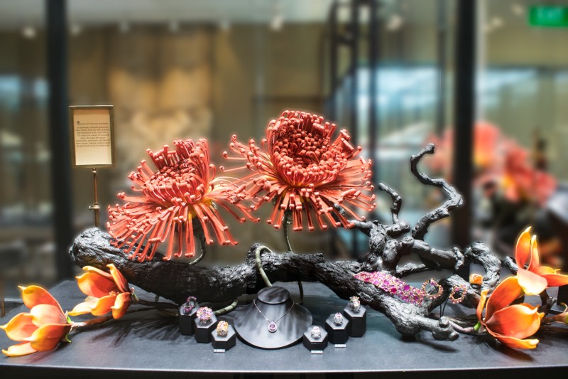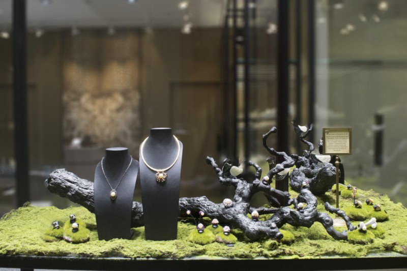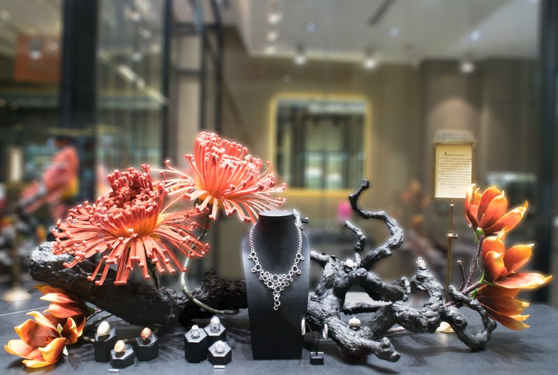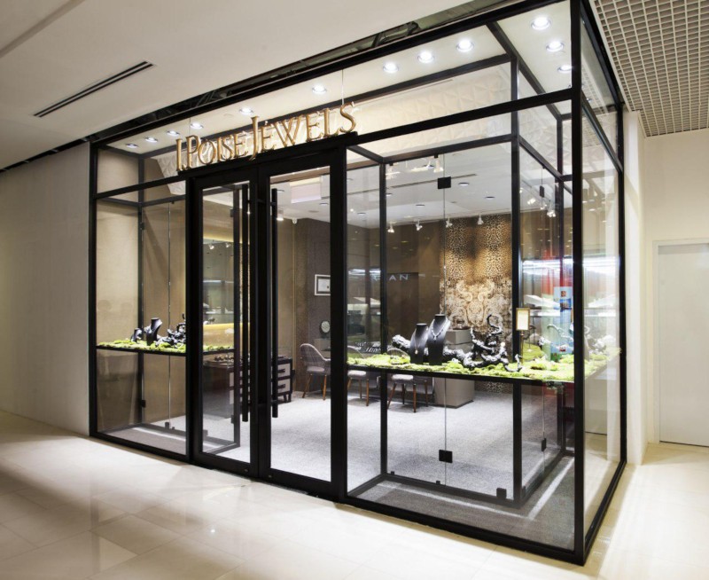 Our design team chose a feature twin lion wallpaper as the boutique’s central wall. Likened to the king of the jungle, this is to signify the jewellery pieces in the boutique are fit for royalty. As for the main showcase, we played around with fictitious branches, moss and grass to recreate a garden with the jewellery pieces as its flowers & fruits.