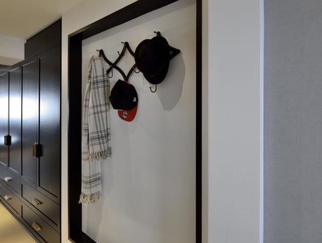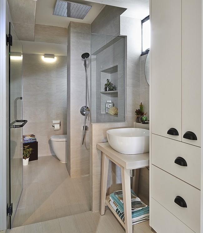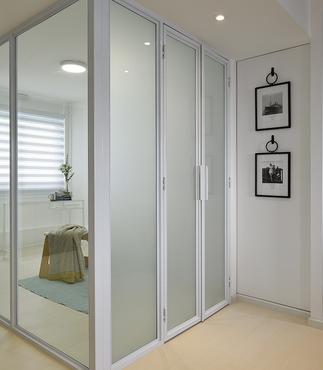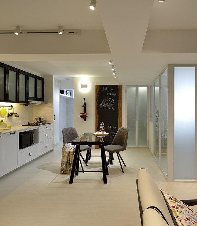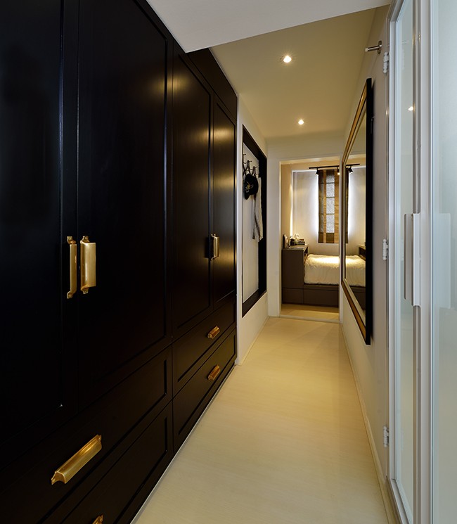 In this project, the home owners specifically noted that they wanted a secret door that leads into their master bedroom. Therefore, we fabricated a solid wood black board feature door, concealing the entrance to the master bedroom perfectly. Our team had also maximized the storage in this limited area of 65 square meters, having multiple storage behind the television console and even a designated shoe area and shoe cabinet.